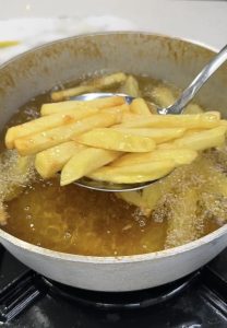 - Cut 3 potatoes into fry shapes, however thick or thin. Any fry shape of your choice is fine. Soak the potatoes in cold water for 10 minutes to remove the starch. Heat your oil to 325 degrees Fahrenheit in a pan, then throw the fries into the oil for 4-5 minutes. Remove from pan, then place them back into the oil for 6-8 minutes or until golden brown and crispy.