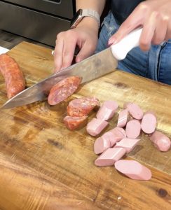 - 2 sausage links of your choice (I’m using chicken hotdogs and chorizo)
